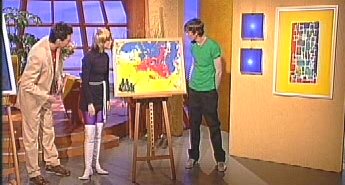 Die Studiogäste (Gruppe "MIA" Berlin) betrachten hier zwei Werke: In der Mitte "Die Besucher" und rechts ein Bild aus dem Zyklus "Farbgefühle".